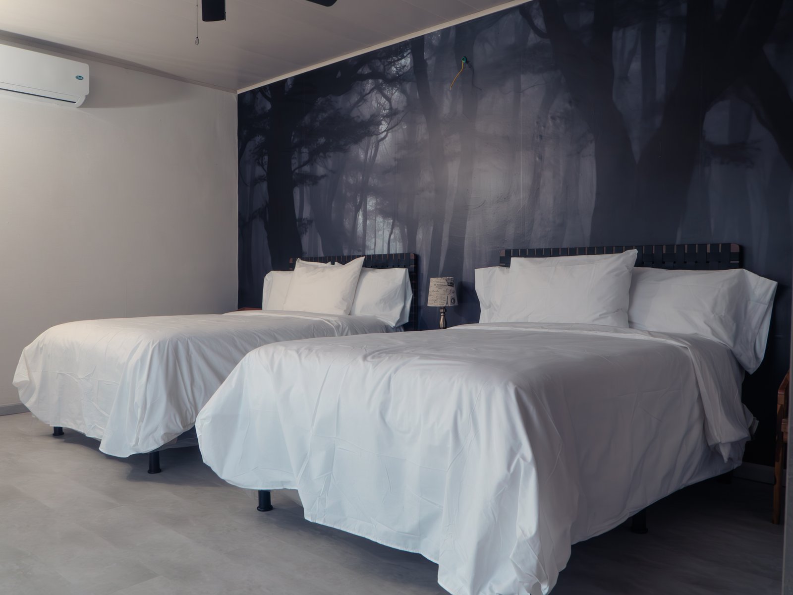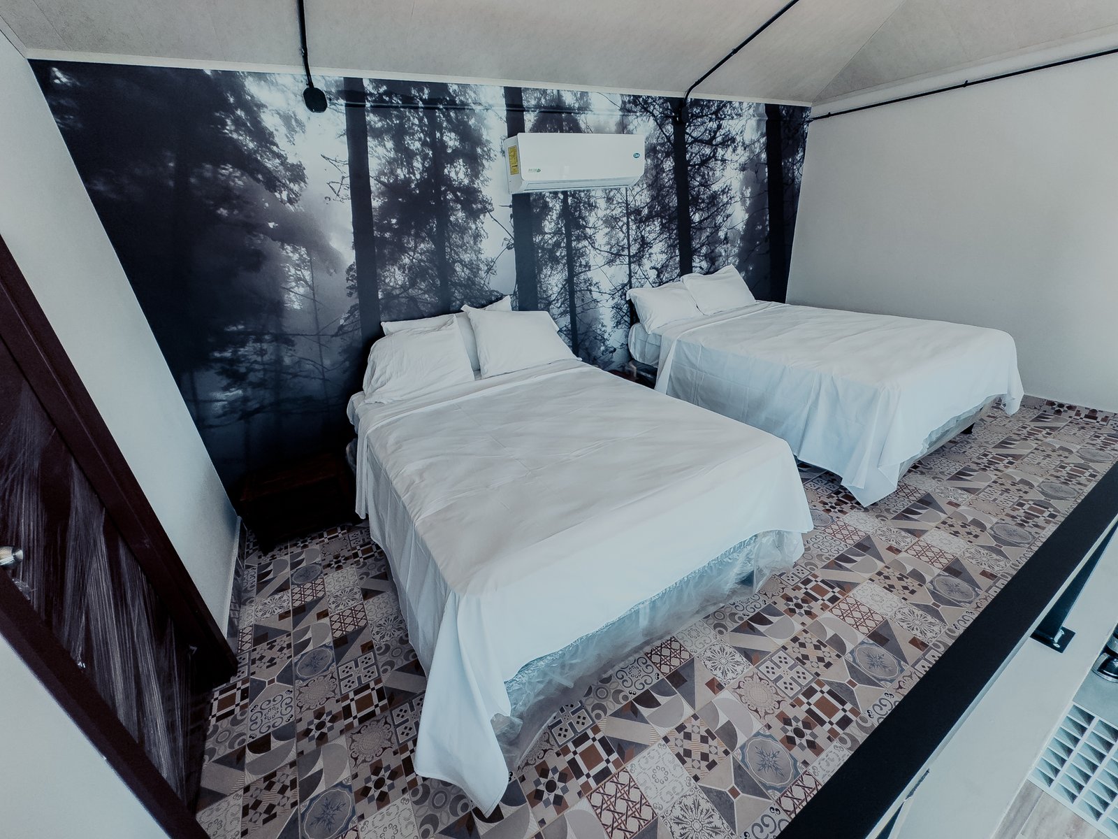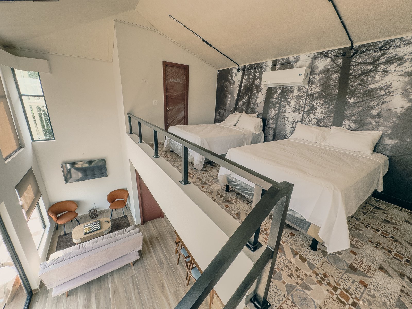 Villa Refugio es una cabaña dúplex de dos niveles, perfecta para familias o grupos que buscan independencia, comodidad y diseño en medio de la montaña. Su arquitectura de ladrillo visto, amplios ventanales y un mural de bosque en blanco y negro crean un ambiente moderno y acogedor.